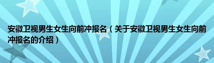 大家好,今天小乐来为大家解答以上的问题。安徽卫视男生女生向前冲报名,关于安徽卫视男生女生向前冲报名的介绍很多人还不知道,现在让我们一起来看看吧!