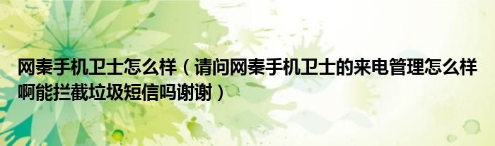 1,请问网秦手机卫士的来电管理怎么样啊能拦截垃圾短信吗谢谢 :网秦手机卫士3.0版在原来的基础上添加上来电管理、垃圾短信过滤、通讯录备份等功能,是能够拦截垃圾短信和骚扰电话的,就通讯管理而言的,基本功能和通讯管家相近,只是少了一个私密空间功能,但是网秦手机卫士的系统管理,开机加速等功能又是通讯管家没有的,算是各有特长。